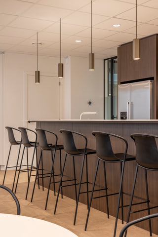 We voorzagen deze werkplek ook van vuilnisbakken, de Ditch 3 pedal in ravenzwart, een afvalsorteersysteem van designer Frans de la Haye. Twee grote metalen lockerkasten van Locker DarkLine hebben een strakke, moderne uitstraling en ze voldoen aan de praktische eisen van dagelijks gebruik. Dankzij de robuuste constructie en diep donkere kleur passen deze lockers perfect in een kantoorruimte. Ook enkele losse rode krukken van TabCollege werden geleverd.