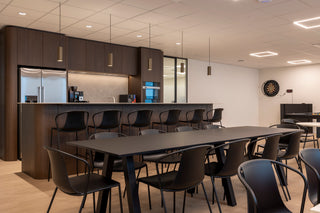 Andere kleine vergaderzalen kregen een ovale Minato Onyx Ellips tafel met zwart onderstel, perfect voor bij de hergebruikte bureaustoelen.