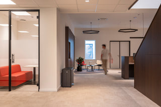 An empty floor was transformed into a spacious new office. Next to the meeting room, a playful brainstorming area was created. The mobile and lightweight Narbutas Giro poufs in cheerful shades of yellow, pink, and mint, in various shapes, pair beautifully with the fun, colorful Parthos coffee tables from the same brand. These tables feature a colored cylindrical base with a round white tabletop. They add flair to the space and are easy to move when needed. Fun pebble-shaped rugs in various colors complete the setting with warmth and cosiness.
