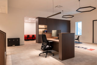 De JOYCE is3 draaibureaustoelen van Interstuhl in zwart en rood, opnieuw de kleuren van het bedrijfslogo, vinden we terug op de verspreide werkplekken, net zoals de ACTIVE.T – Dubbel-Bench bureaus van König + Neurath   die voorzien zijn van een antraciet middenpaneel dat de nodige privacy biedt. Ze zijn gemotoriseerd en individueel elektrisch verstelbaar. Ideaal om afwisselend zittend of staand te werken! Ze hebben een grijswit blad en zwart frame. Van dezelfde firma werden ook tal van BASIC.4 tafels  geleverd, in dezelfde kleuren. Dit zijn klassieke 4-pootsbureaus met een uitstekende prijs- kwaliteitsverhouding. De handige losse kasten ACTA.PLUS van König + Neurath staan hier verspreid opgesteld. Ze zijn grijswit en hebben een zwarte greep en er werd telkens een zwarte plantenbak op gemonteerd.