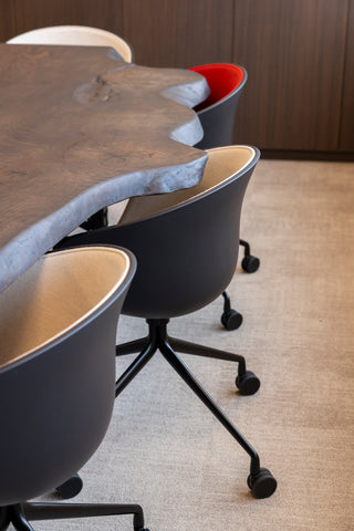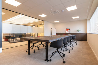 In de vergaderruimte voor tien personen plaatsten we de Veneto XL vergadertafel met zwart onderstel van het Belgische Perfecta; de voormalige vergaderstoelen werden er hergebruikt.
